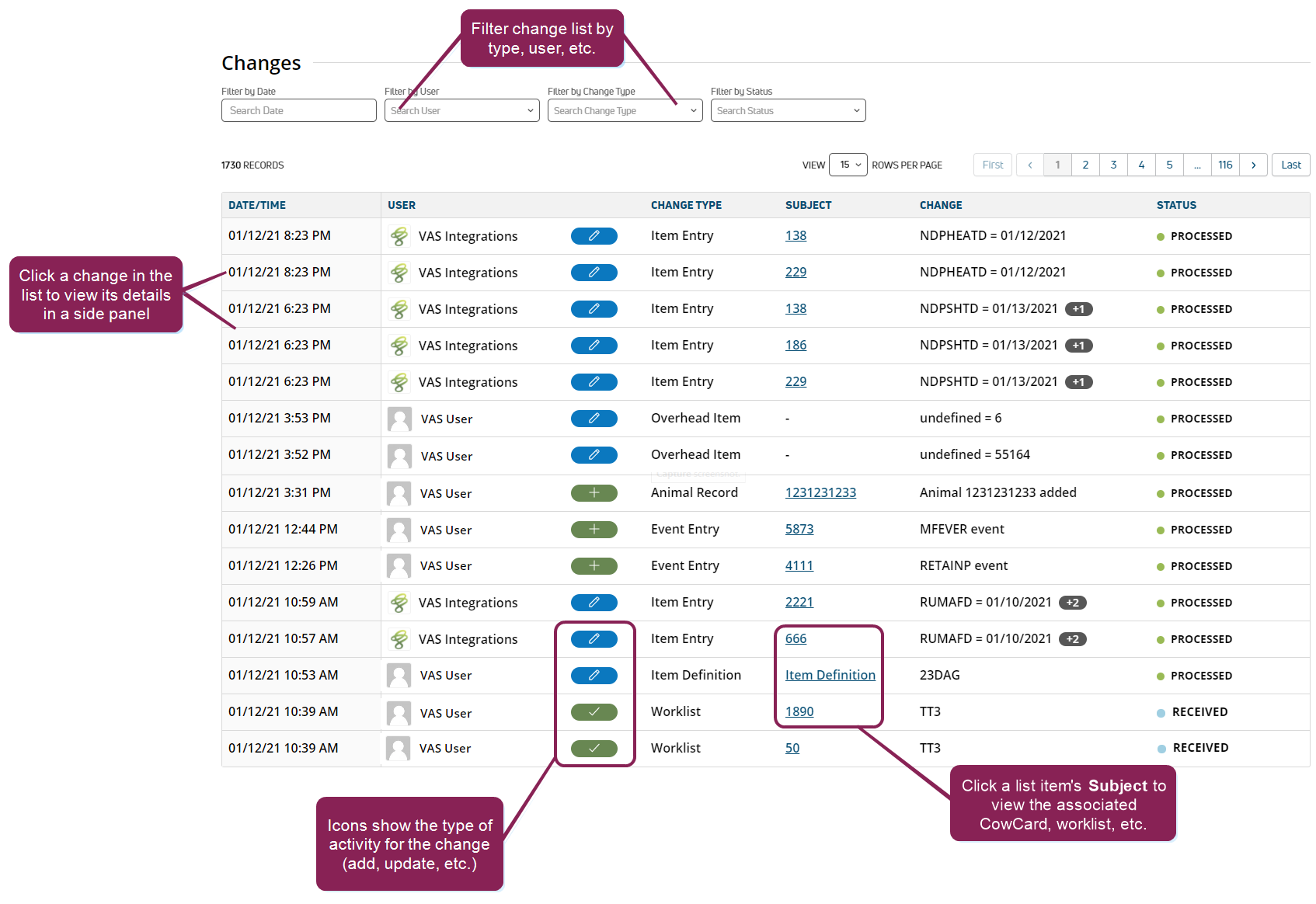 - Subject: An active link to the object or type of data object changed. Click on the subject of a change to view the associated CowCard, worklist, etc.