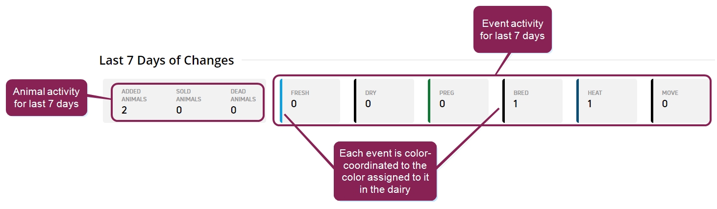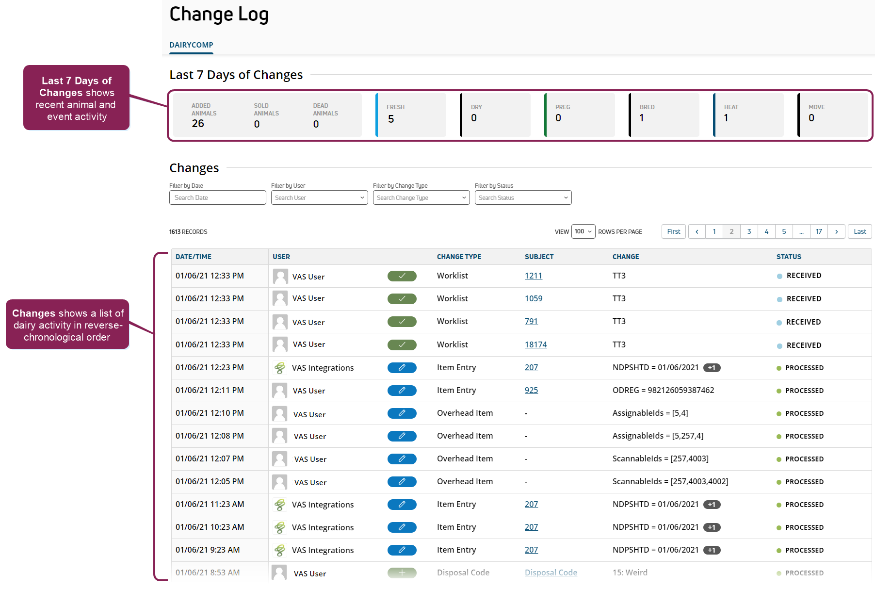 The Change Log provides an easy to use summary and historical list of animal activity and data changes made within the dairy. The top of the Change Log shows a breakdown of animal activity and events for the past 7 days, while beneath that is a list of all major data changes that have occurred for the dairy. You can find this feature under the Dairy menu.