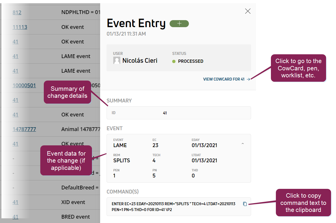 - If the change has a DairyComp command associated with it, the side panel includes the command. You can copy the command to the clipboard by clicking the copy icon