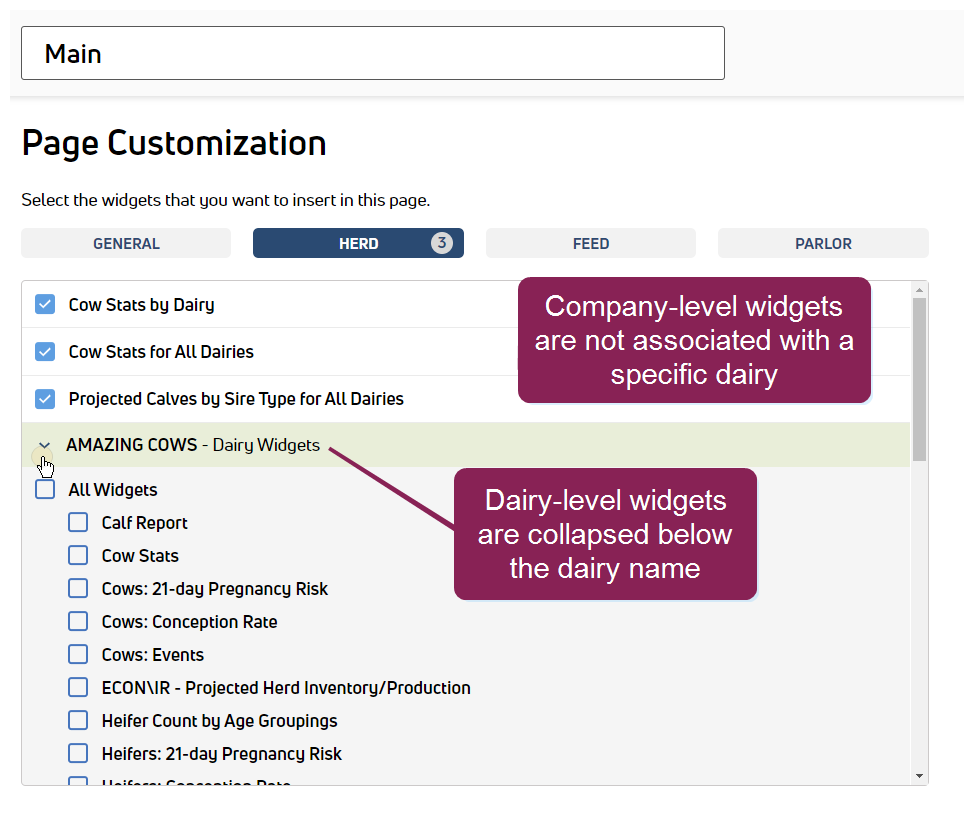 You can add both company-level and dairy-level widgets to optimize your company dashboard. Expand the sections below to learn more: