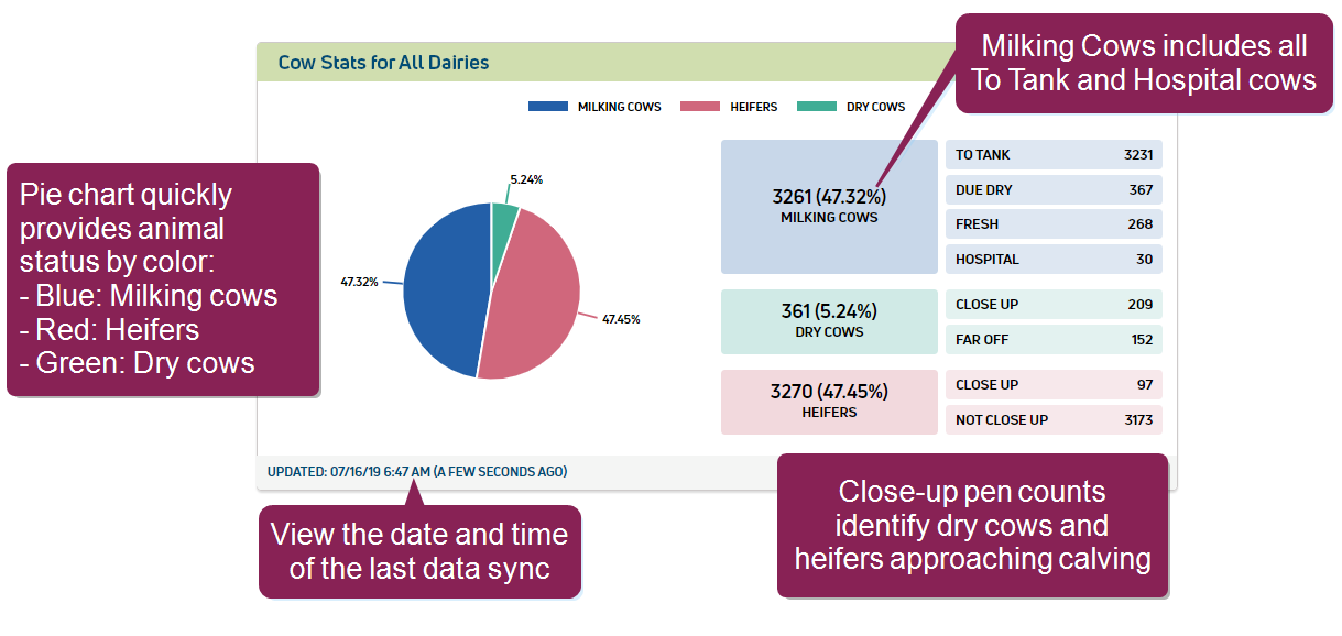 • The color-coded pie chart and detailed area to the right contain data for milking cows (blue), dry cows (green), and heifers (red).