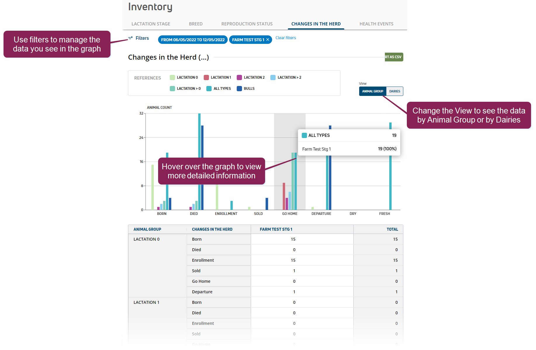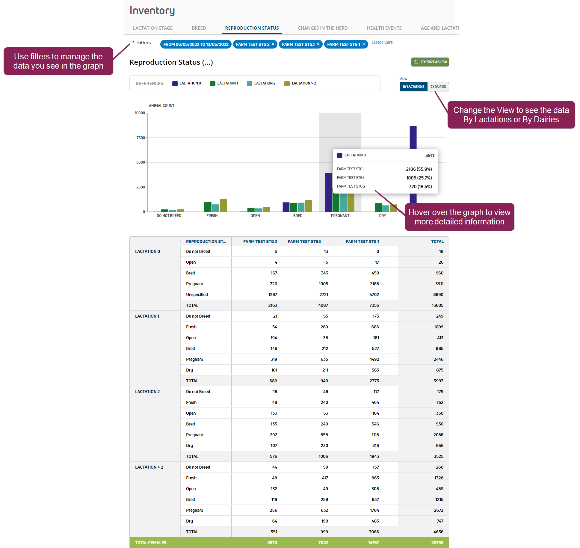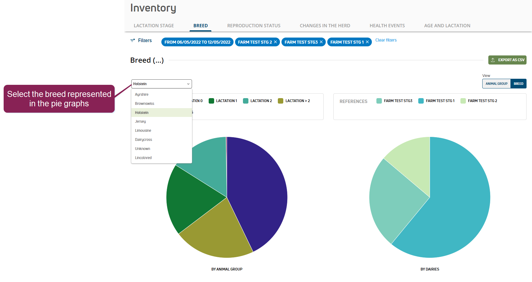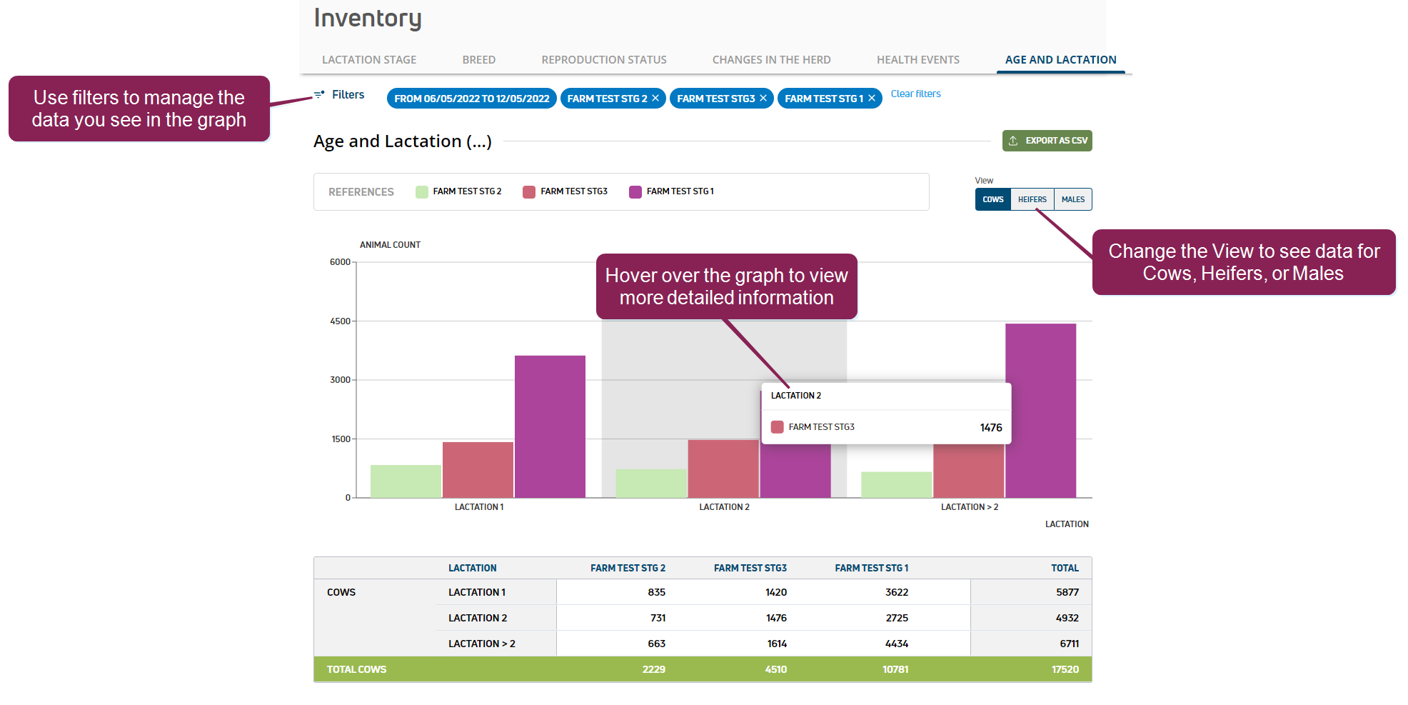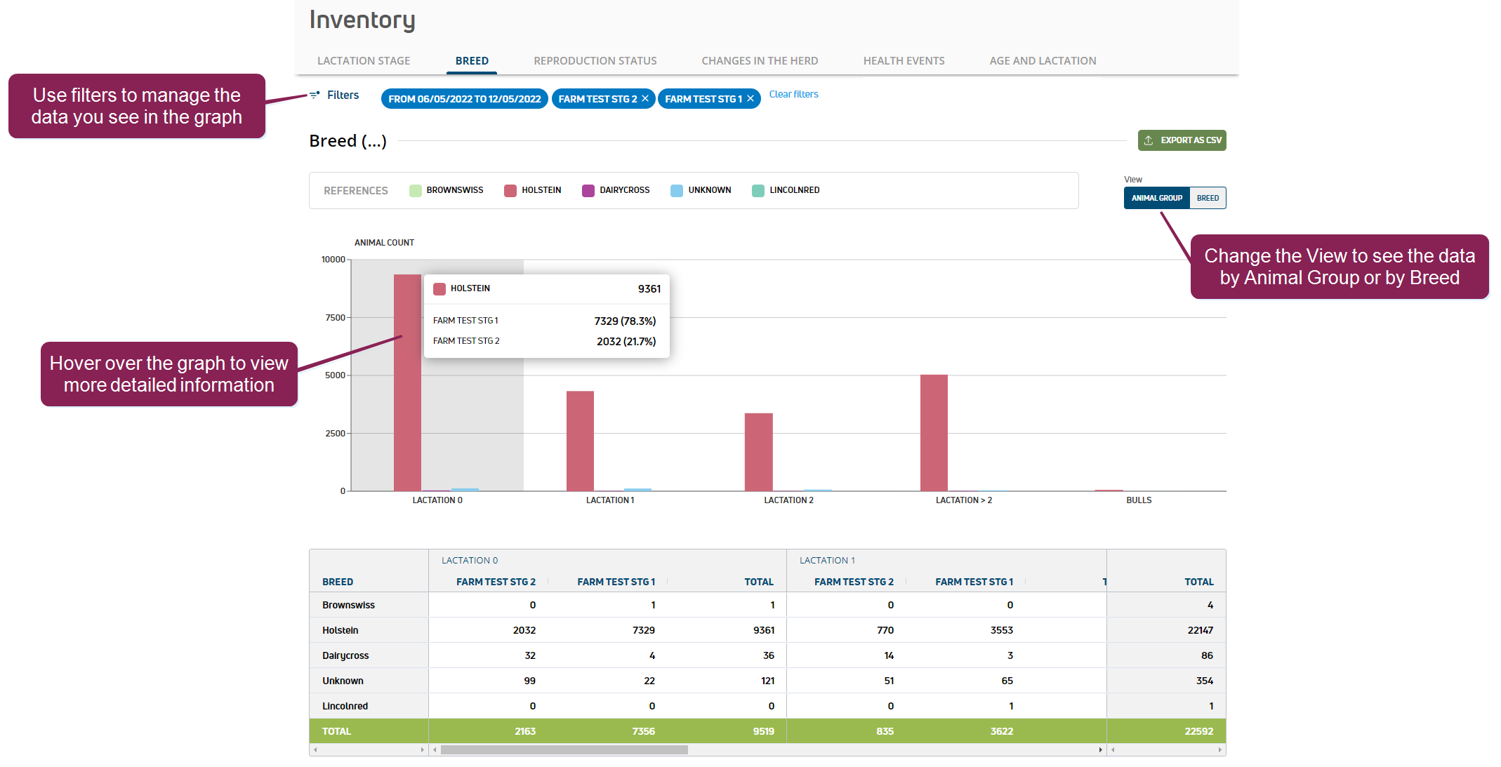 Use the Inventory dashboard to quickly view your current inventory across all dairies in clear, easy-to-follow graphs. Use the data to identify, review, and analyze current inventory trends. You can switch between tabs to see the breakdown of your inventory in different ways: by lactation stage, breed, reproduction status, changes in the herd, health events, or age and lactation group.