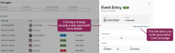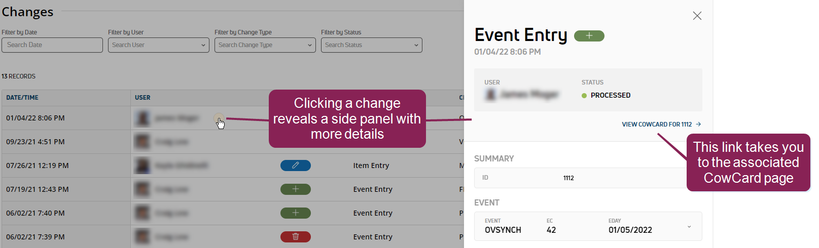 Click on any row in the table to display the change details in a side panel. Within the side panel, you can click the View CowCard link to jump to the CowCard page associated with the change.