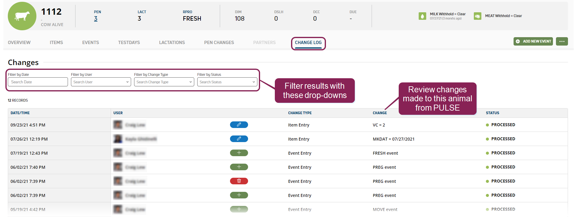 The Change Log tab on the CowCard displays a history of the updates made to an animal from PULSE. You can use the Filter fields above the table to only see changes that match your criteria.