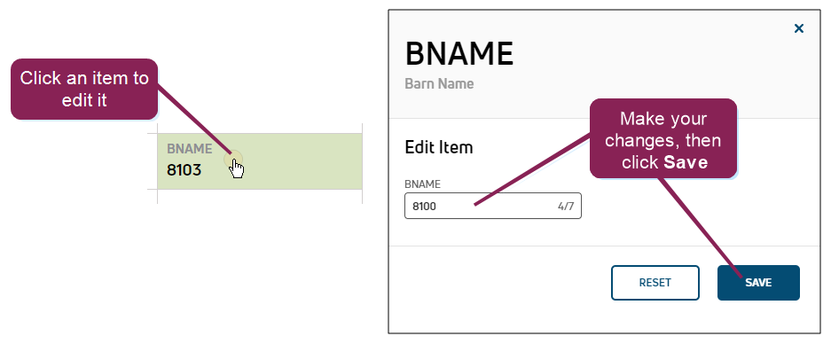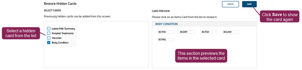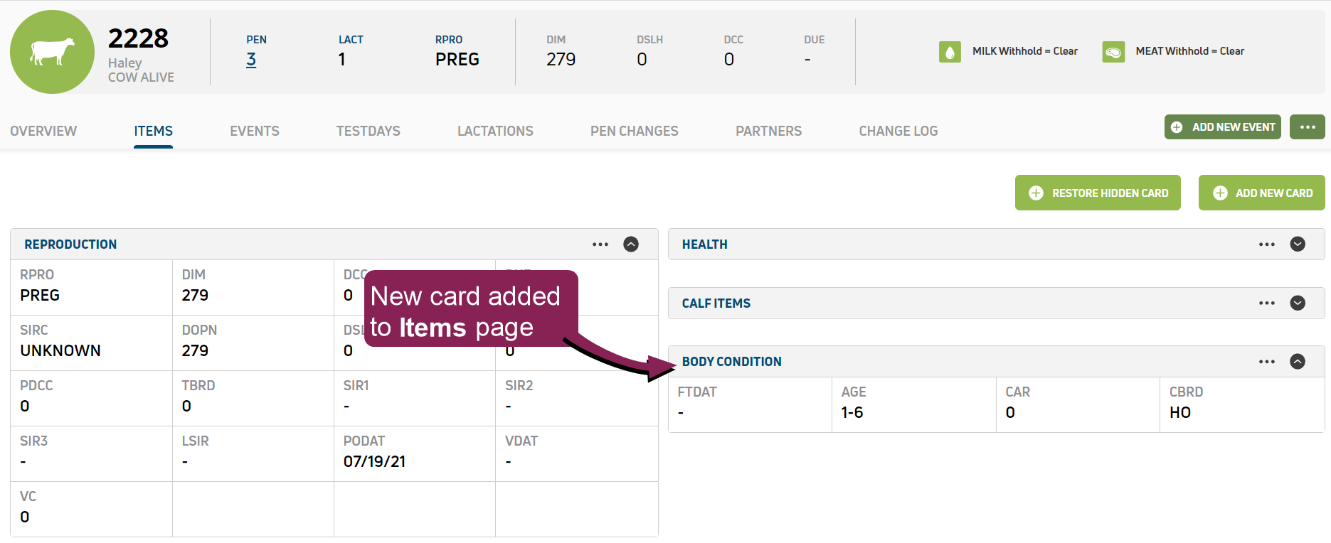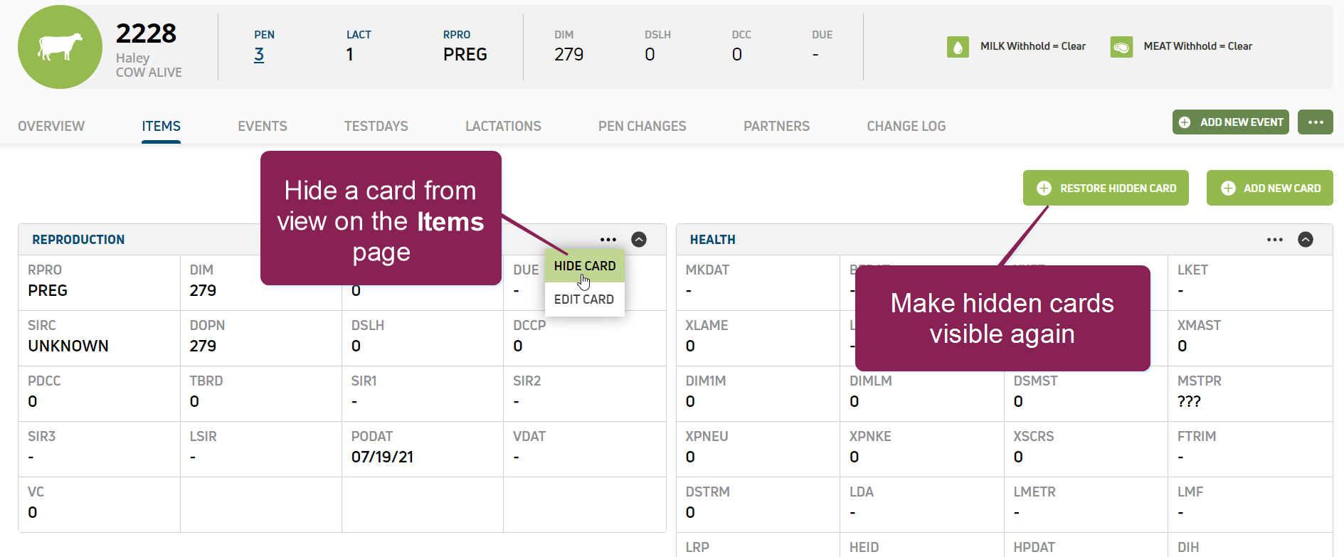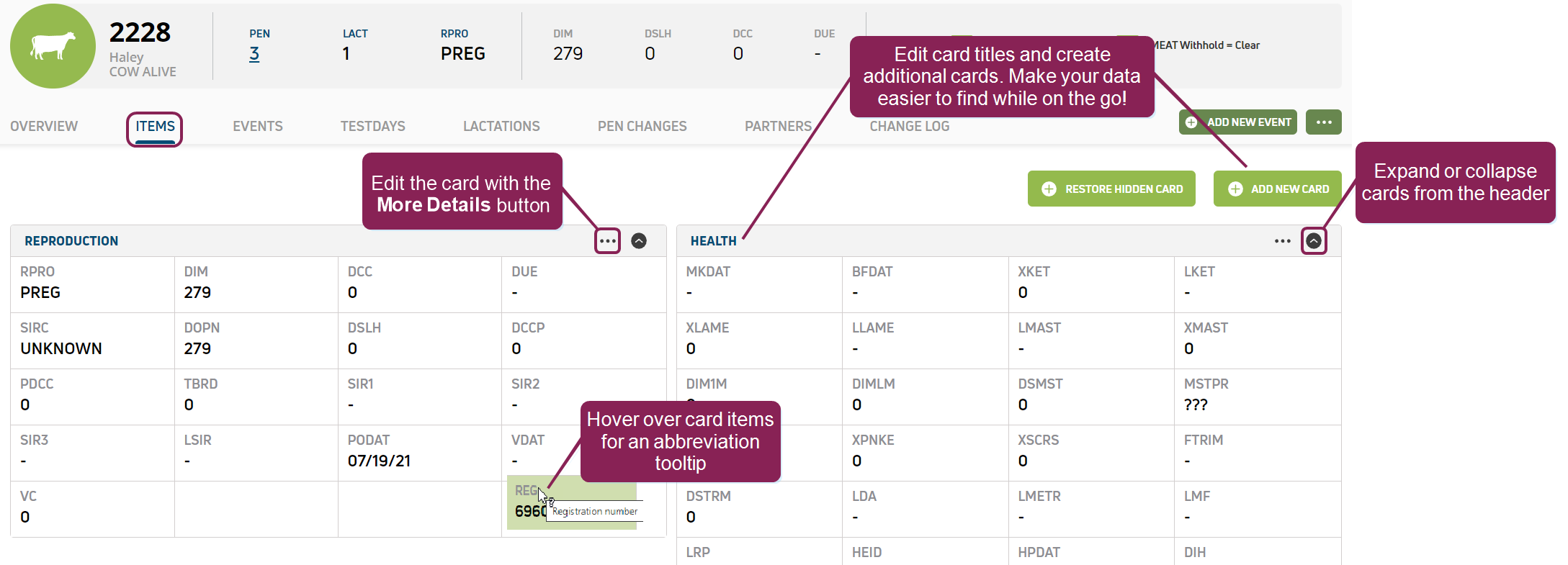 PULSE CowCards display all of your items on one page. You can expand and collapse each item card and edit the titles and items contained within each card. You can also hide item cards from view altogether or only on the mobile app. If you're unsure what an abbreviation means, hover your cursor over it to display a pop‑up tooltip.