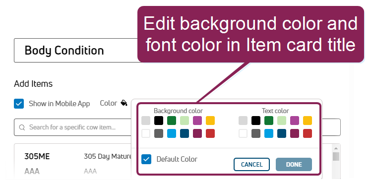 - Click the Color link below the Card Name field to select a background color and text color for the item card title bar.