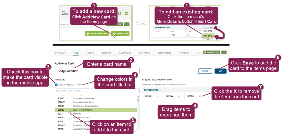 The instructions for adding a new item card and editing one are very similar. Follow the steps below to get started.