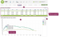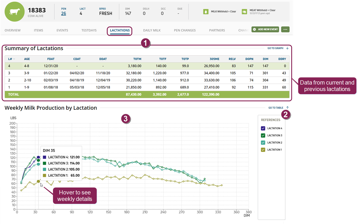 - Weekly Milk Production by Lactation: Each point on the graph represents the average milk weight recorded over the course of a week. Hovering your cursor over a point displays a pop-up containing the average milk weights during that week for all lactations on the graph.