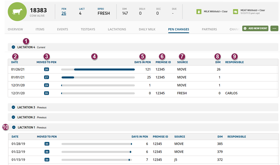 - You can expand any other lactation section to see previous pen change details. Multiple sections can be opened at the same time.