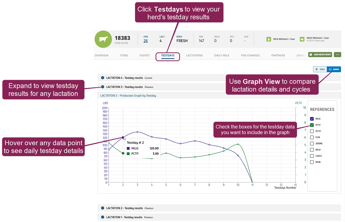 Click on any testday to open the Testdays page, where you can view straightforward, easy-to-follow graphs and summaries about your herd's testday results.