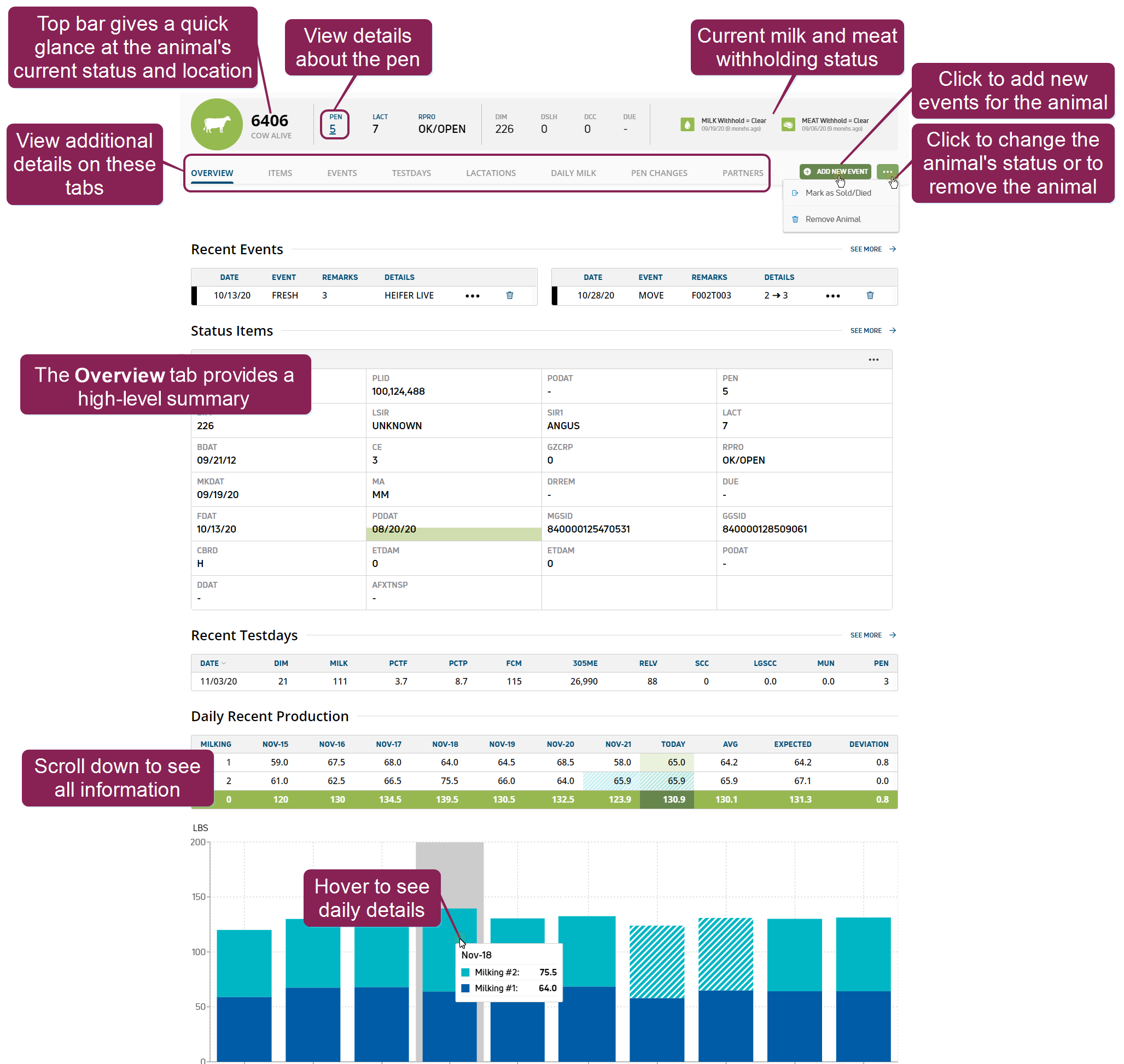VAS PULSE Platform CowCards provide a single, highly customizable location for you to monitor your herd. With the ability to view an animal's Items, Events, Testdays, and Lactations, as well as switch easily between data view and graph view, any dairy member can find what they need, whether it's an animal's current status and pen location or its recent milk weights and lactation cycles: