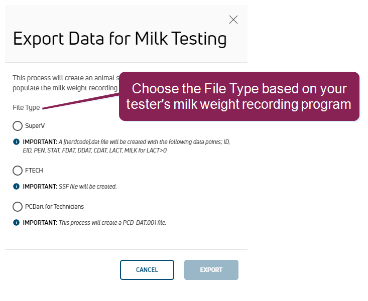 - Depending on the file type selected, the file (DAT, SSF, or PCD-DAT.001 file format) is saved to your local Downloads folder. Provide the file to your milk tester to import into their milk recording program.
