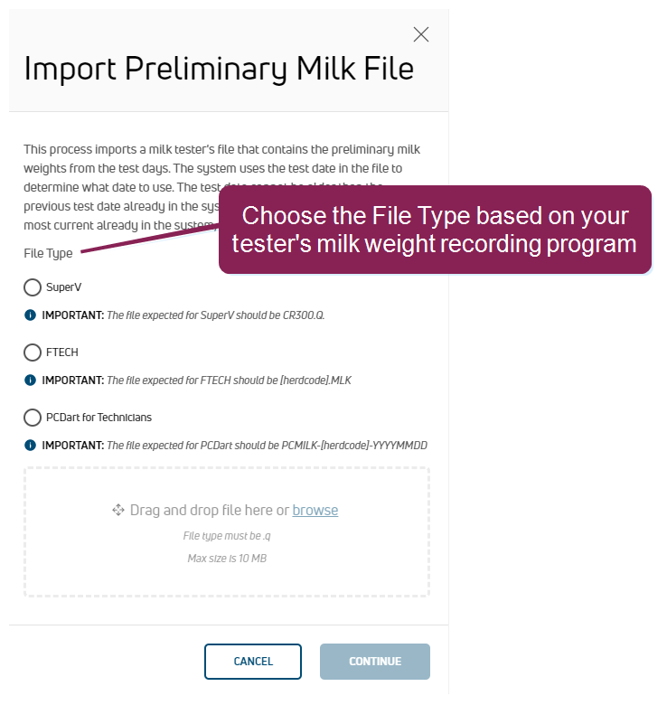 After milk weights are collected, click Import Preliminary Milk File to pull in the file from your milk tester:
