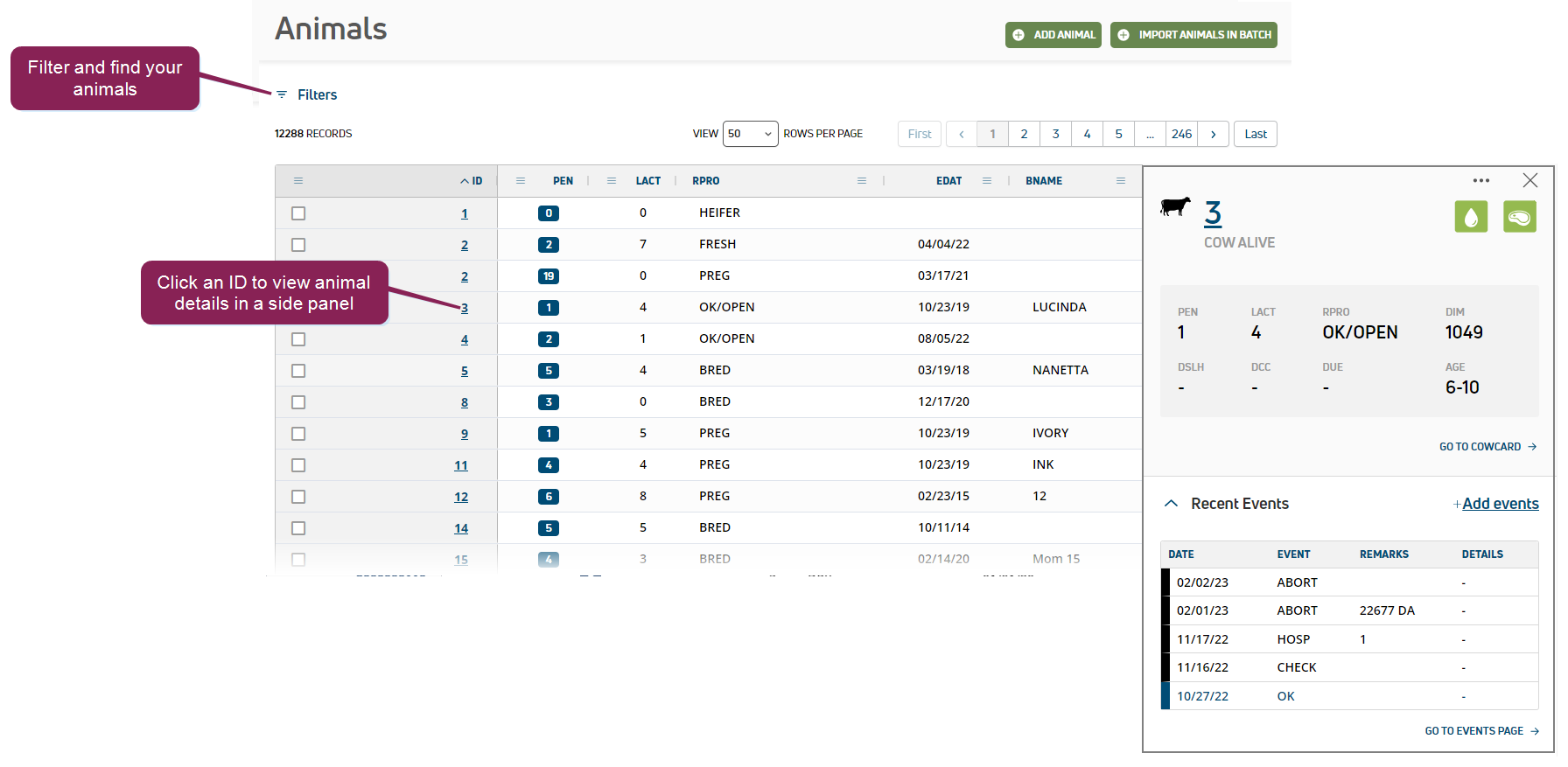• To view a summary of an animal, click on its ID to open a side panel without leaving the page.