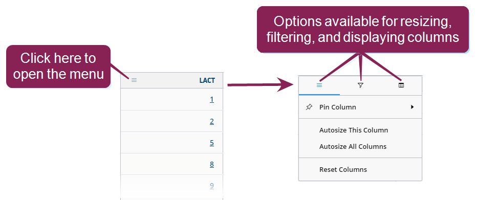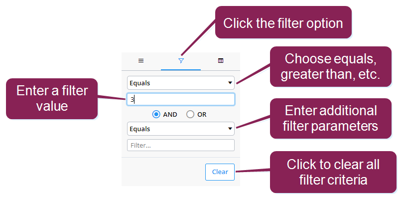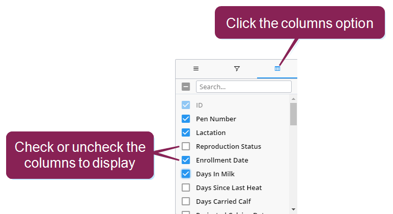 • Click Filters to search for specific animals or to limit the animals shown by pen, lactation, or reproductive code (RCClosed Reproductive code).