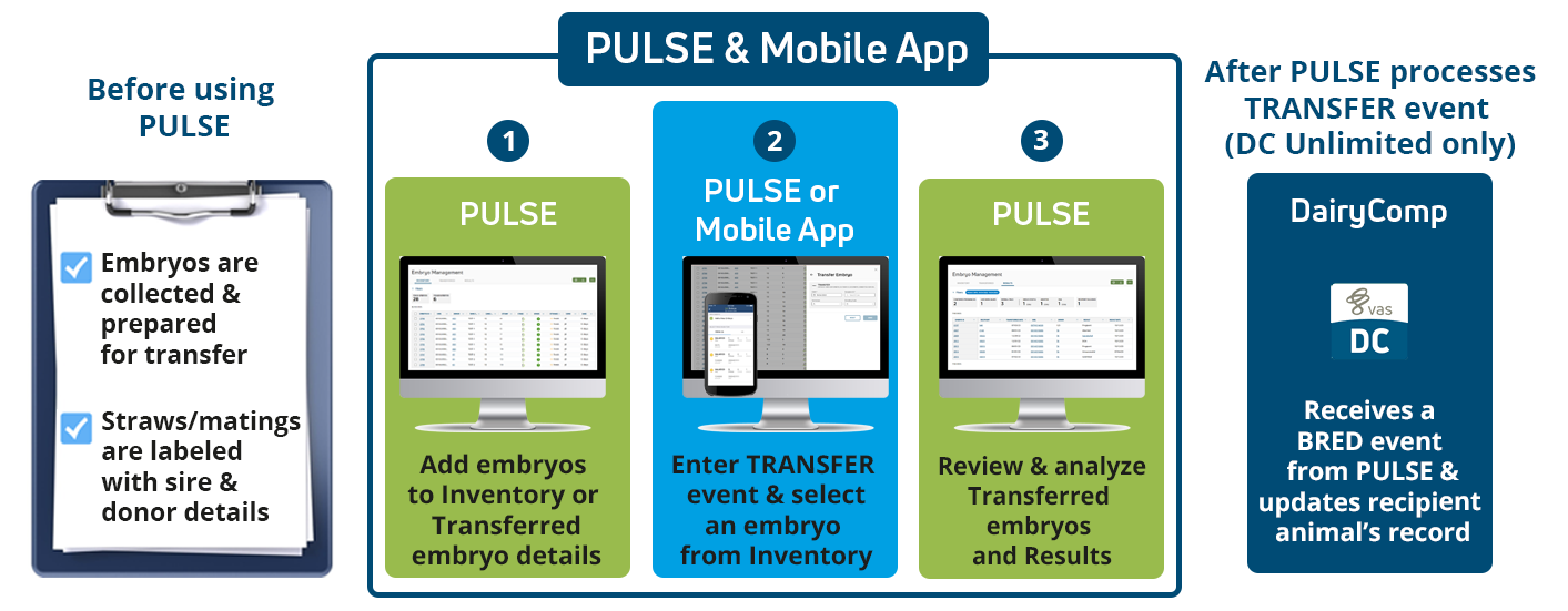 After your embryos are collected and prepared for transfer, you can add them to inventory and then select them while adding embryo TRANSFER events. Or, use the batch import process to import embryos to inventory or add completed transfers. Then track transferred embryos and your results from PULSE.