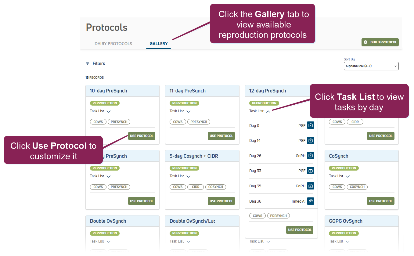The Protocols Gallery includes standard reproduction protocol templates your dairy can customize and save.