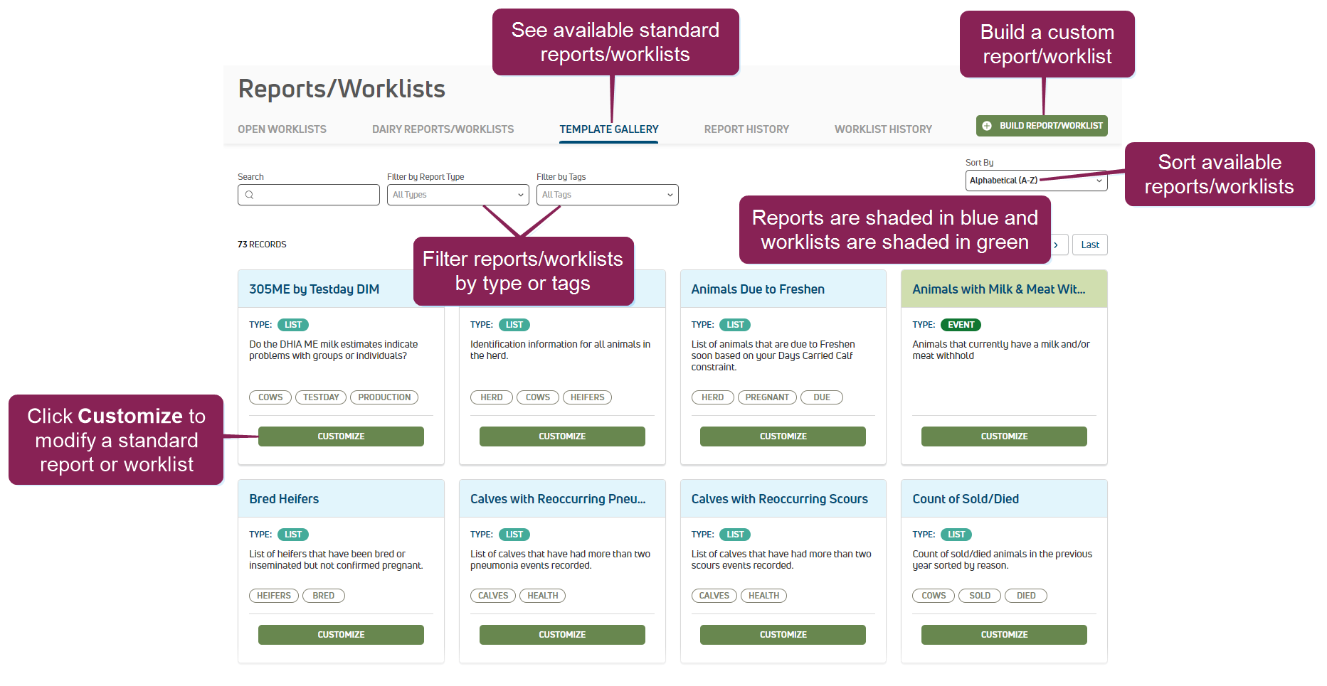 The Template Gallery page provides all standard reports and worklists that are available for your dairy within PULSE. Note that reports are shaded in blue and worklists are shaded in green.