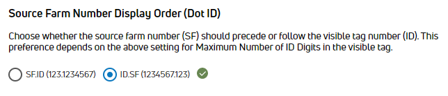 Source Farm Number Display Order: Choose whether the source farm number should precede or follow the visible tag number. This preference depends on the setting for Maximum Number of Visible ID Digits (above).