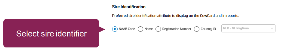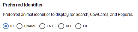 Preferred Identifier: Select the preferred animal identifier to use for search, on CowCards, and in reports.