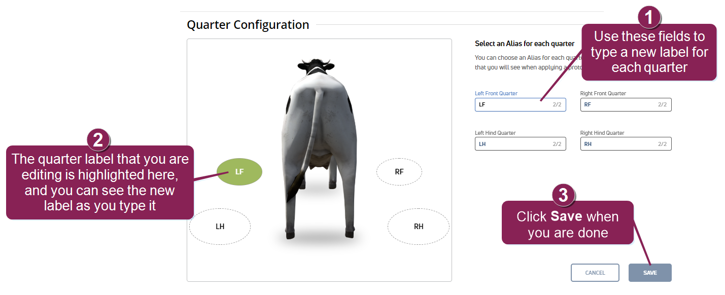 The typical quarter labels are illustrated in the image below. Complete these steps if your dairy prefers to use different labels.