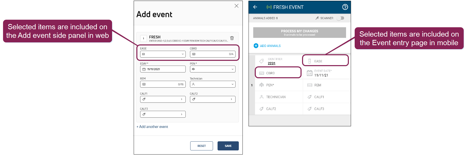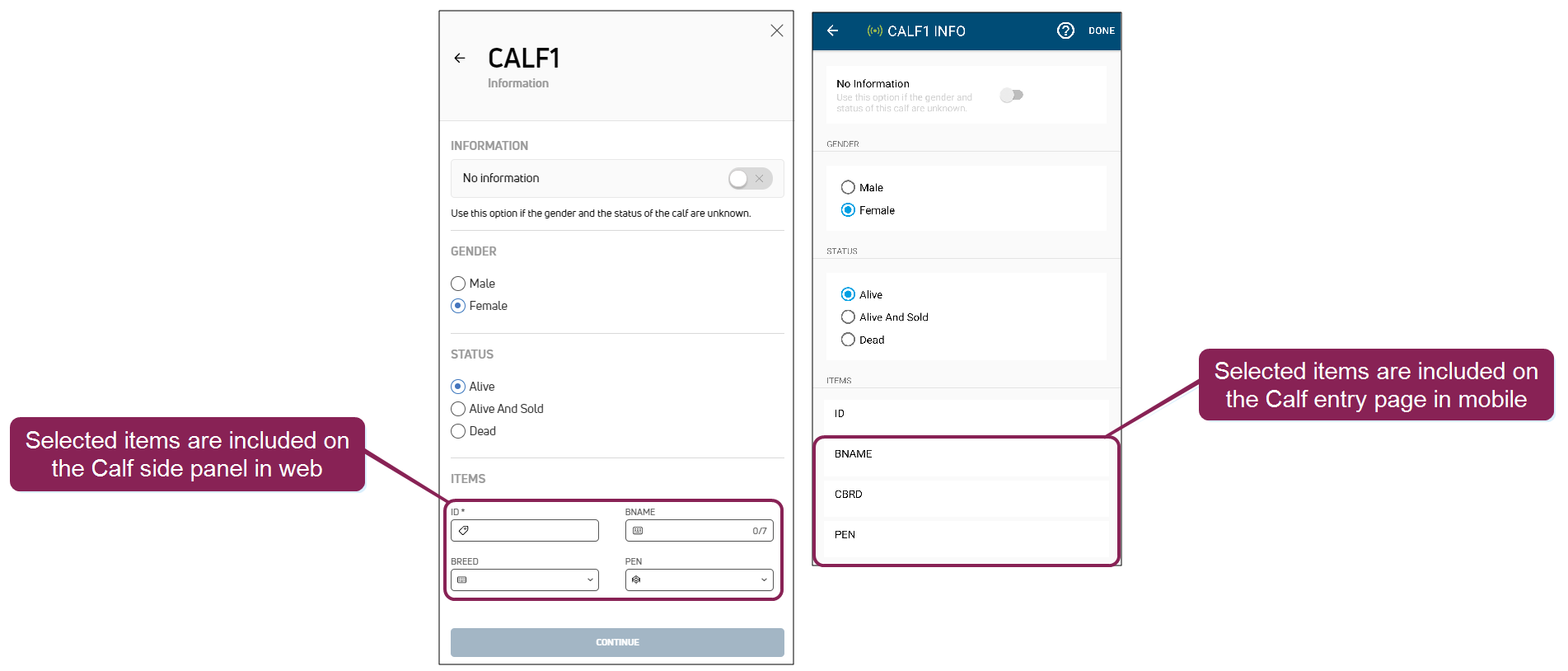 Adding items here makes them available on the Calf side panel in web, as well as the Calf entry page in the mobile app. For MyDC dairies, these items are also available from the calf's BIRTH event. See BIRTH Event (MyDC only) to learn more.