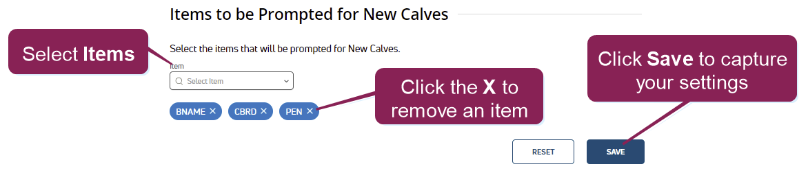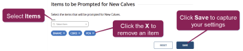 You can customize which items are available for data entry when entering calf details. Select an item from the drop-down list to add it, or click the X to remove an item.