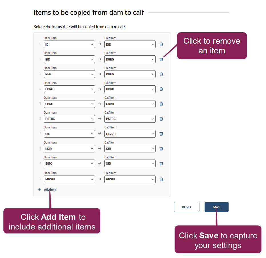 Sire identifier) to copy it to the calf maternal grandsire (MGSIR). Click Add Item and choose the Dam Item to copy to a Calf Item.