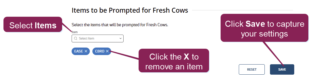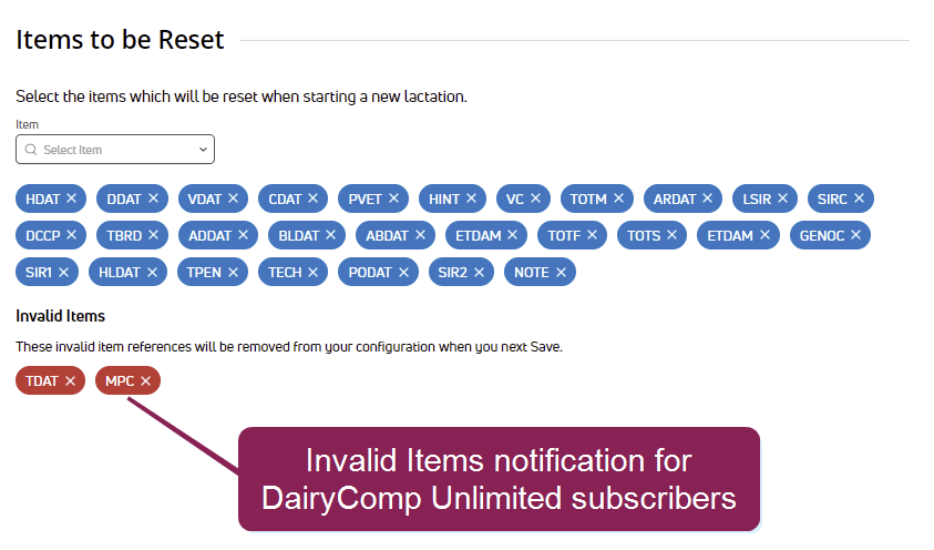 DairyComp Unlimited subscribers may see Invalid Items in your Items to be Reset section.