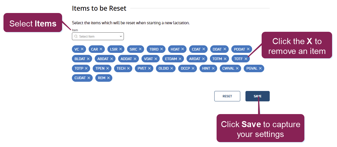 Invalid Items do not affect the functionality of resetting items for new lactations. You may opt to click the X to remove the items, or leave them as is and they will be returned to the Items to be Reset list as soon as they become available.