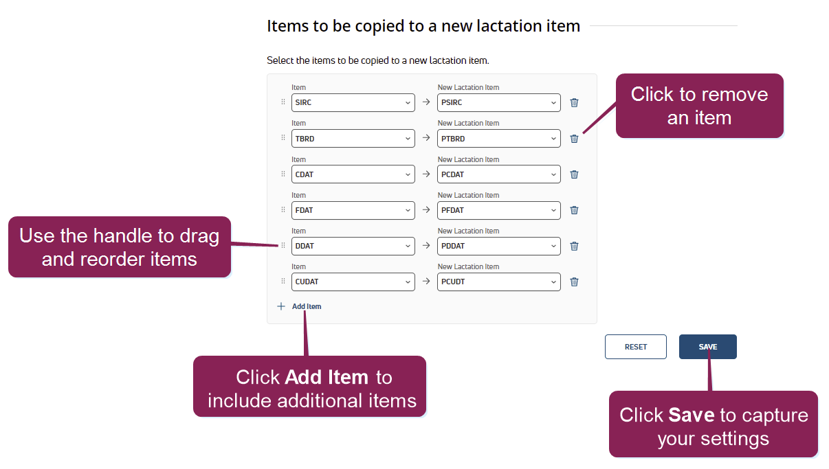 You'll likely want to save data from the previous lactation when a new lactation begins, including dates and breeding details (times bred, sire, etc.). Click Add Item, and then choose the Item and corresponding New Lactation Item to have the data copied to the new lactation.