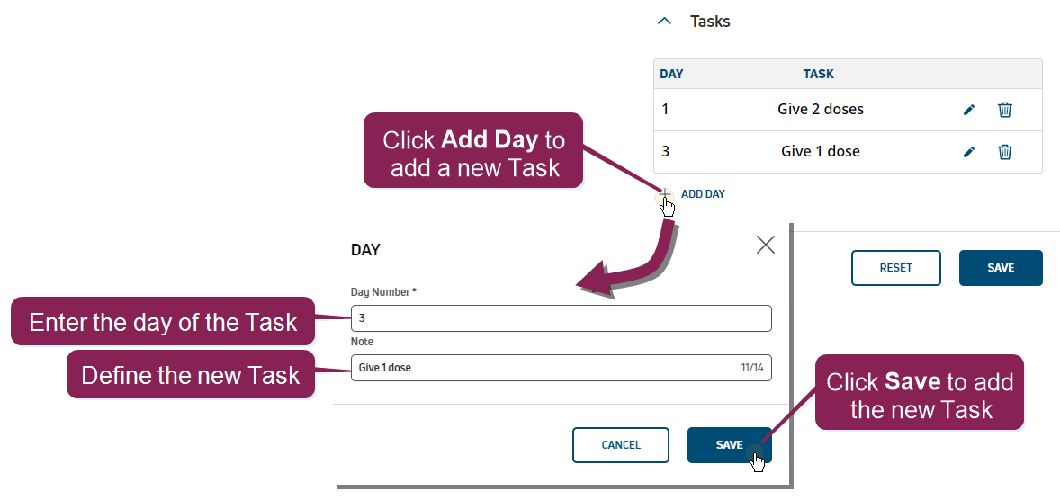 - Tasks: You must add at least one Task before you can save the protocol. A Task is an action that users must follow to complete the protocol. For example, a Task on Day 1 might instruct the user to "Give 2 doses," and a Task on Day 3 might instruct the user to "Give 1 dose."