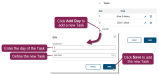 To add a Task, expand the Task drop-down section and click Add Day. In the pop-up window, enter the task that should be followed in the Note field, using 14 characters or less. In the Day field, enter the day that the task should be executed. Click Save to finish adding your Task.
