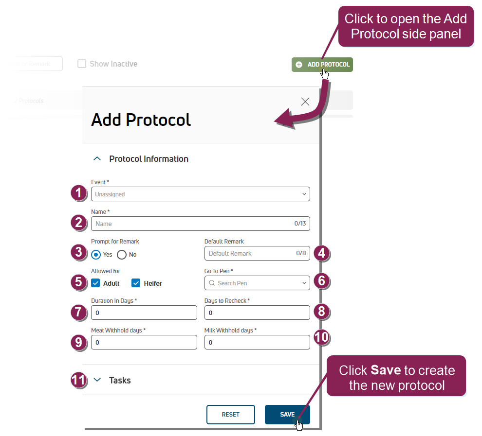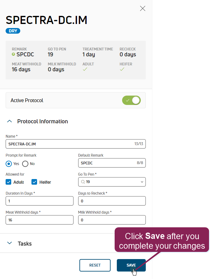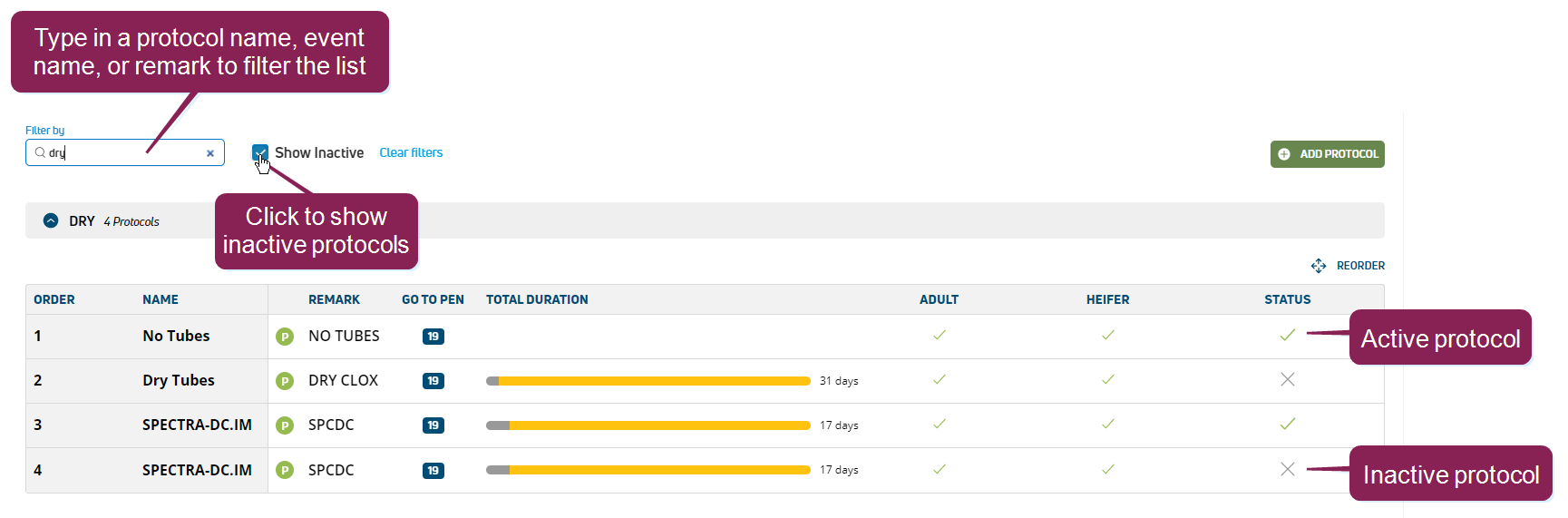 - Adult and Heifer: Defines whether this protocol can or cannot be used on heifers or adult animals.