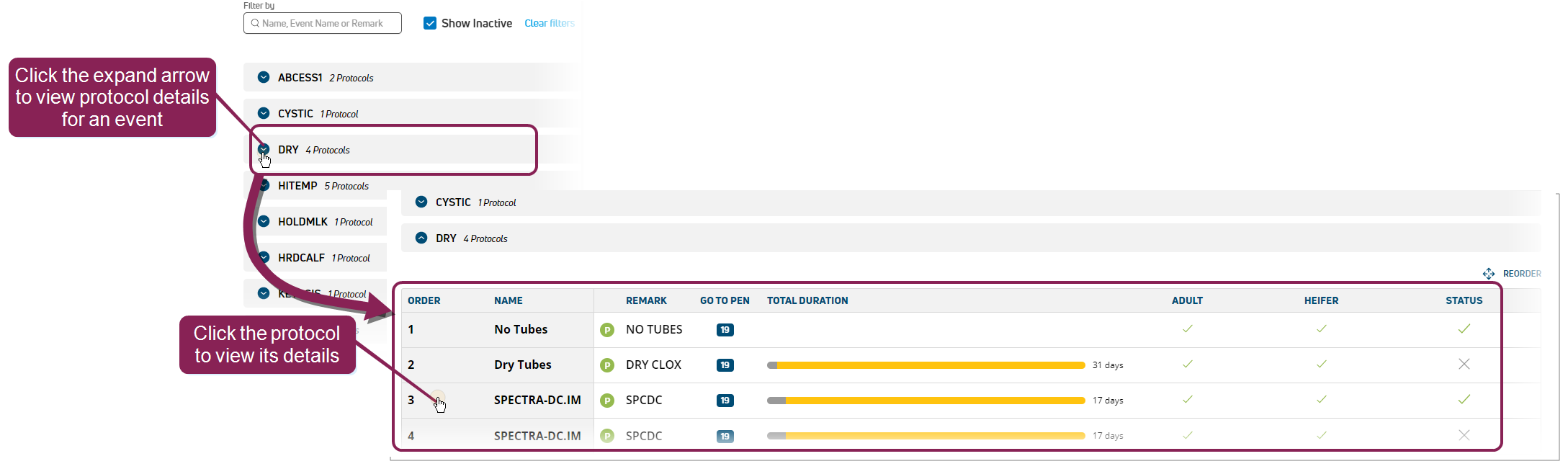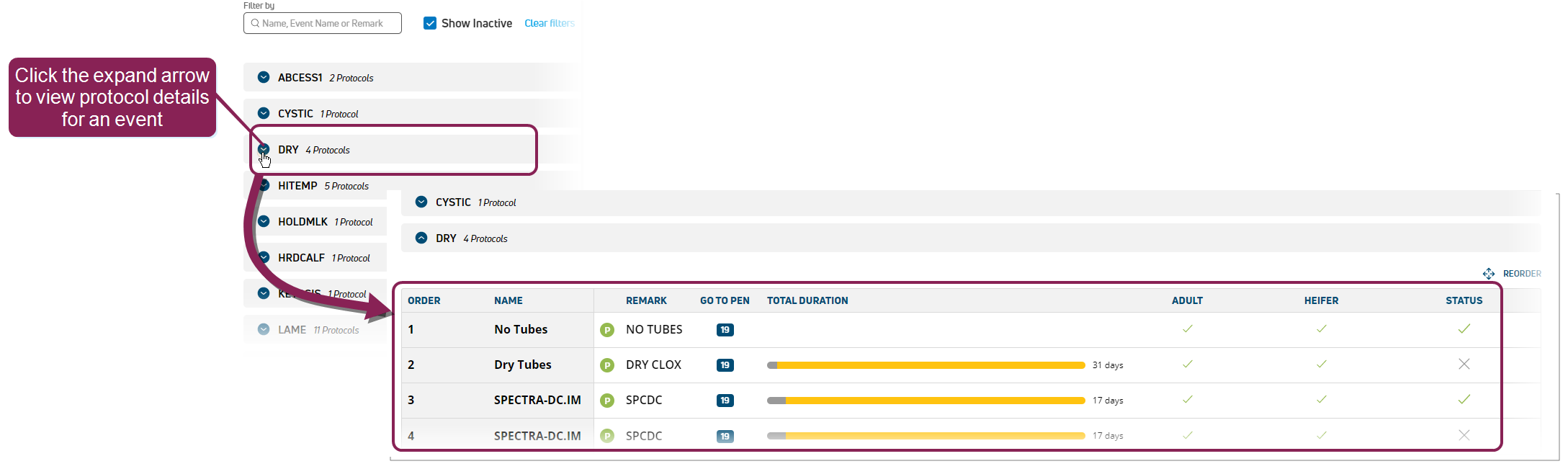 On the Protocols page, you can view a list of all the events in your dairy. Expand an event to view the protocols associated with the event, as well as a few protocol details like protocol name, the duration of an protocol, and whether the protocol can be used for adults or heifers.