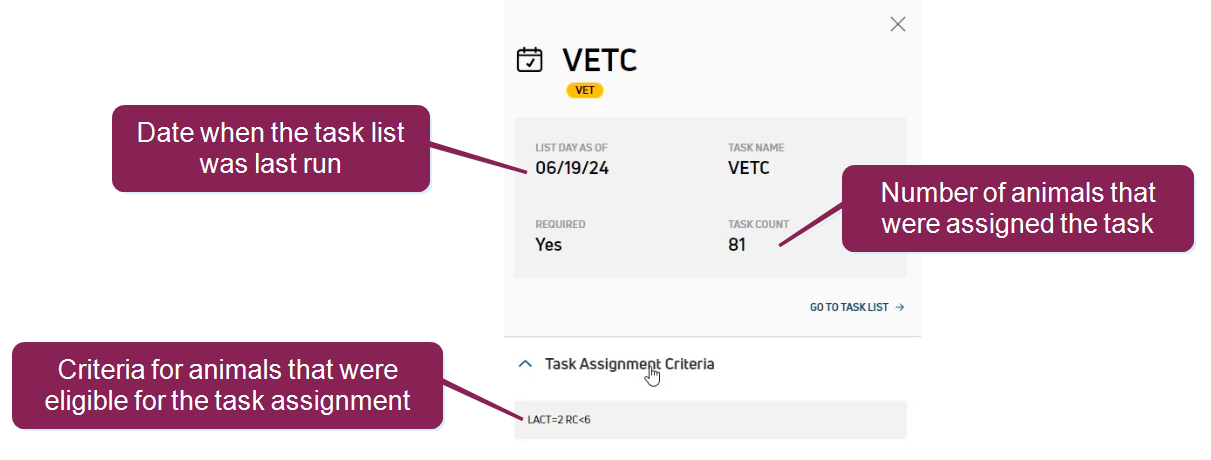- Click the task list name to view details including when the task list was assigned, the assignment criteria, and the task count (or how many animals were assigned the task):