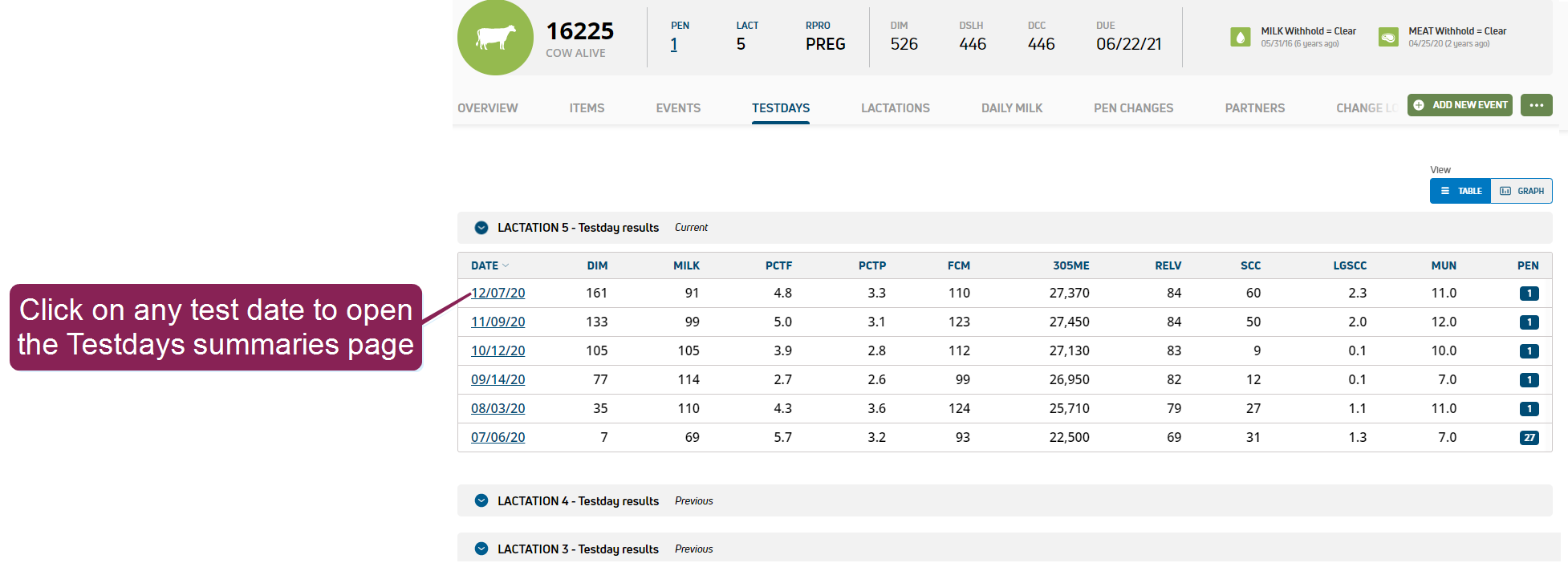 You can find this feature on the Testdays tab on an animal's CowCard or under the DairyComp/MyDC menu: