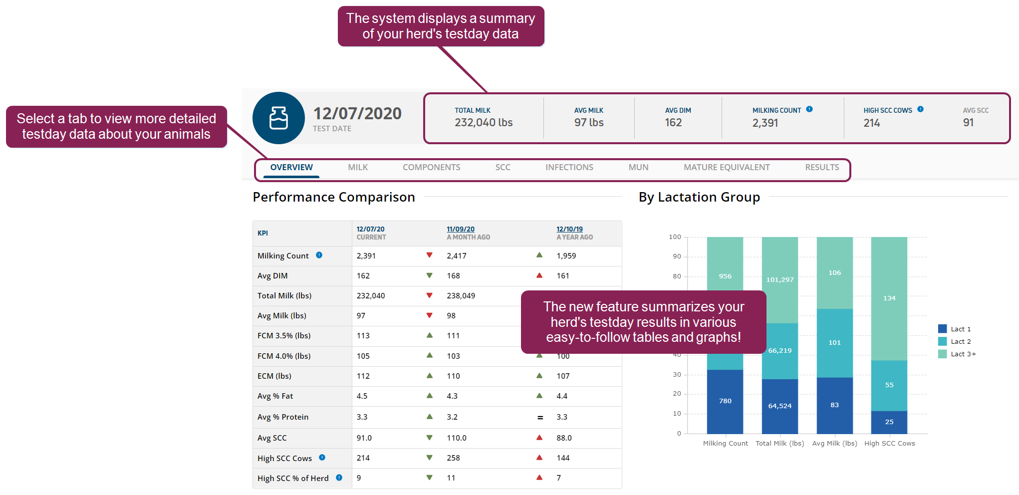 Check the Overview tab for a quick look at your herd's performance on testday. You can easily identify whether there are differences between your animals' performance this year and last year or differences between lactation groups.