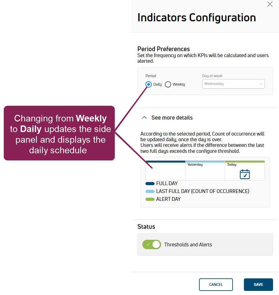 - Green shows the next day when PULSE will examine thresholds and send alerts.
