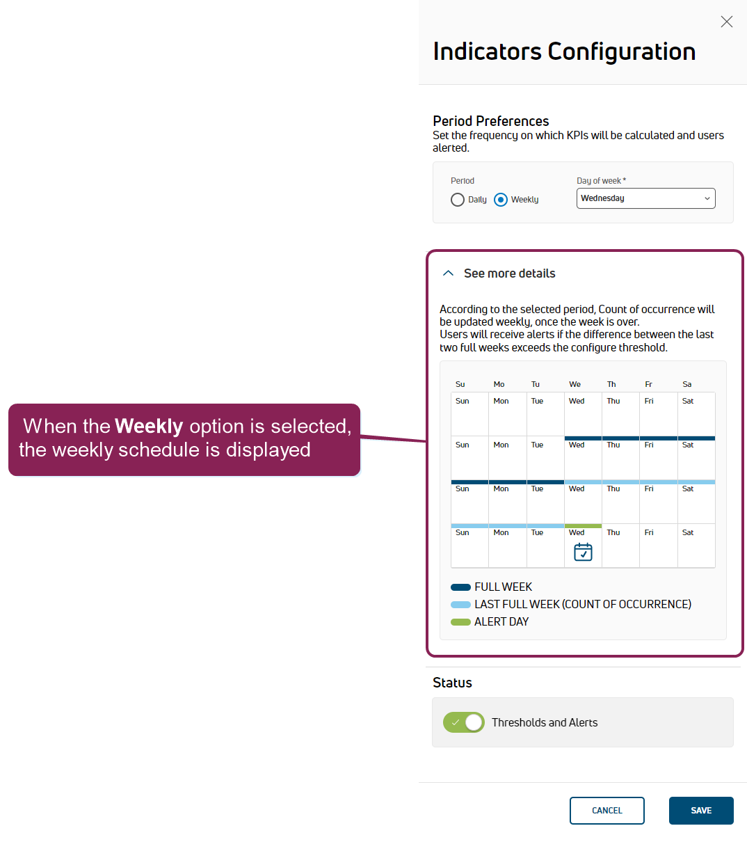 For the weekly schedule, this means that PULSE examines thresholds and sends alerts on the day of the week you selected. In the example above, Wednesday (the day highlighted in green) is the one selected. If your herd exceeds an alert threshold value from the previous two periods (the previous week in dark blue and the last week in light blue), PULSE notifies your team on that Wednesday.