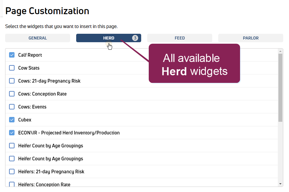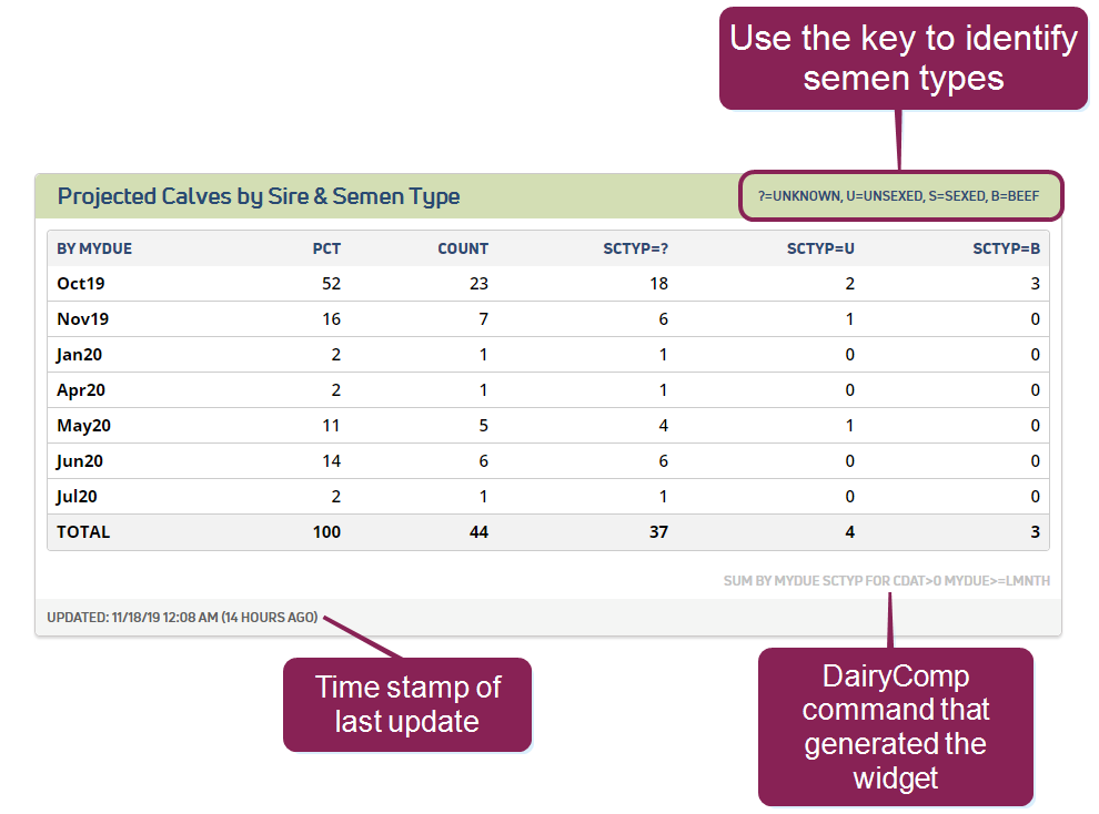 The Projected Calves by Sire & Semen Type dairy widget identifies the expected number of calves to be born in upcoming months, including data for 7 to 8 months. This information helps to plan for Replacement Heifers that will be added to your herd by month. It also allows you to analyze parentage information for your calves.
