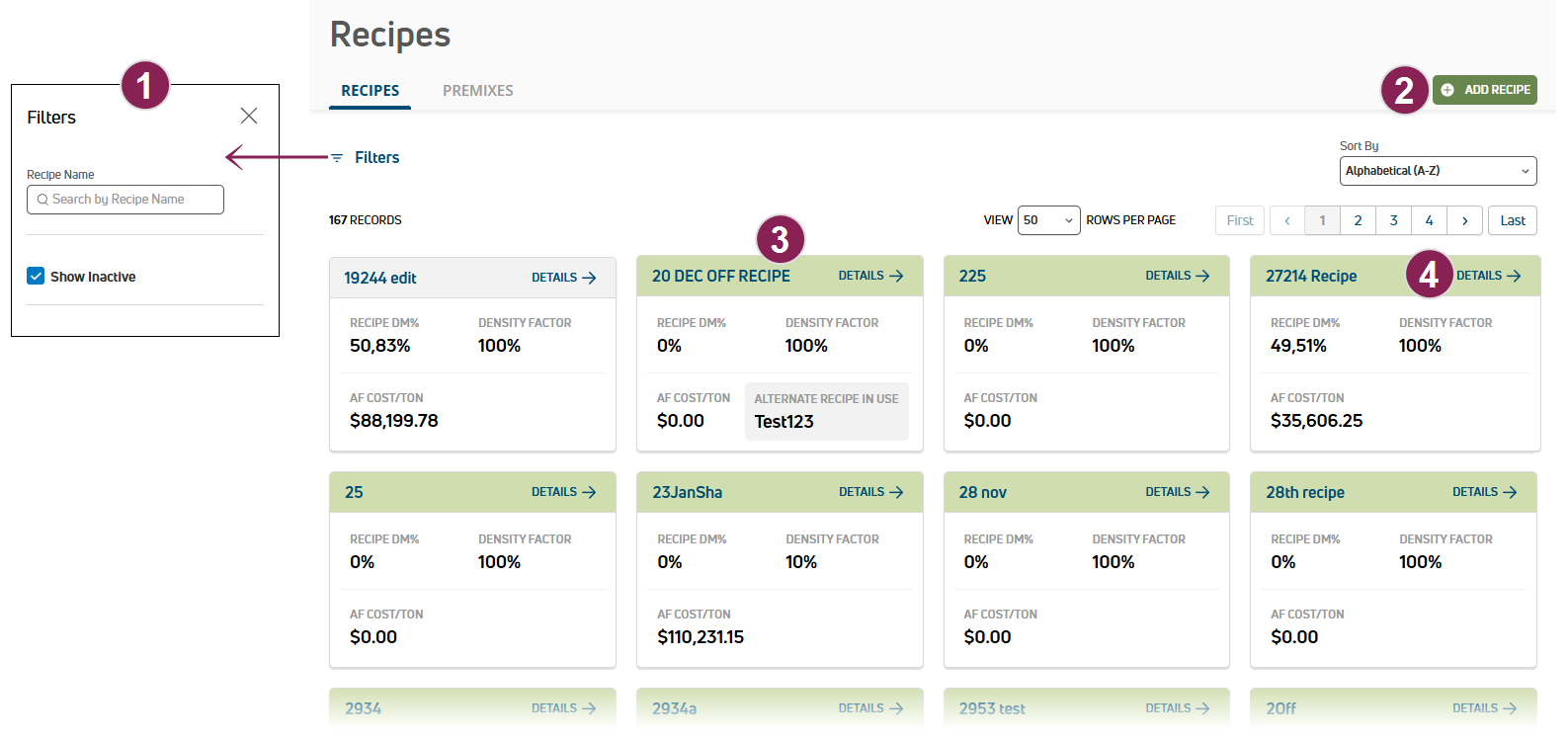 At the top left of the page, click the Recipes tab to view all available recipesClosed A combination of ingredients used to make feed for animals in FeedComp. Or, click the Premixes tab to view all available premixes. Expand the sections below to learn more: