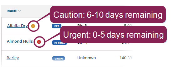 • Days Left: Estimated days remaining before the inventory runs out. This estimation is based on FeedWatch (on-premise) values. If a feeder uses too much/little of an ingredient or the inventory is not accurate, this date may be incorrect. Be sure to check your actual inventory if this date seems unreasonable.