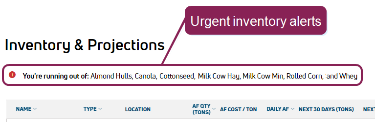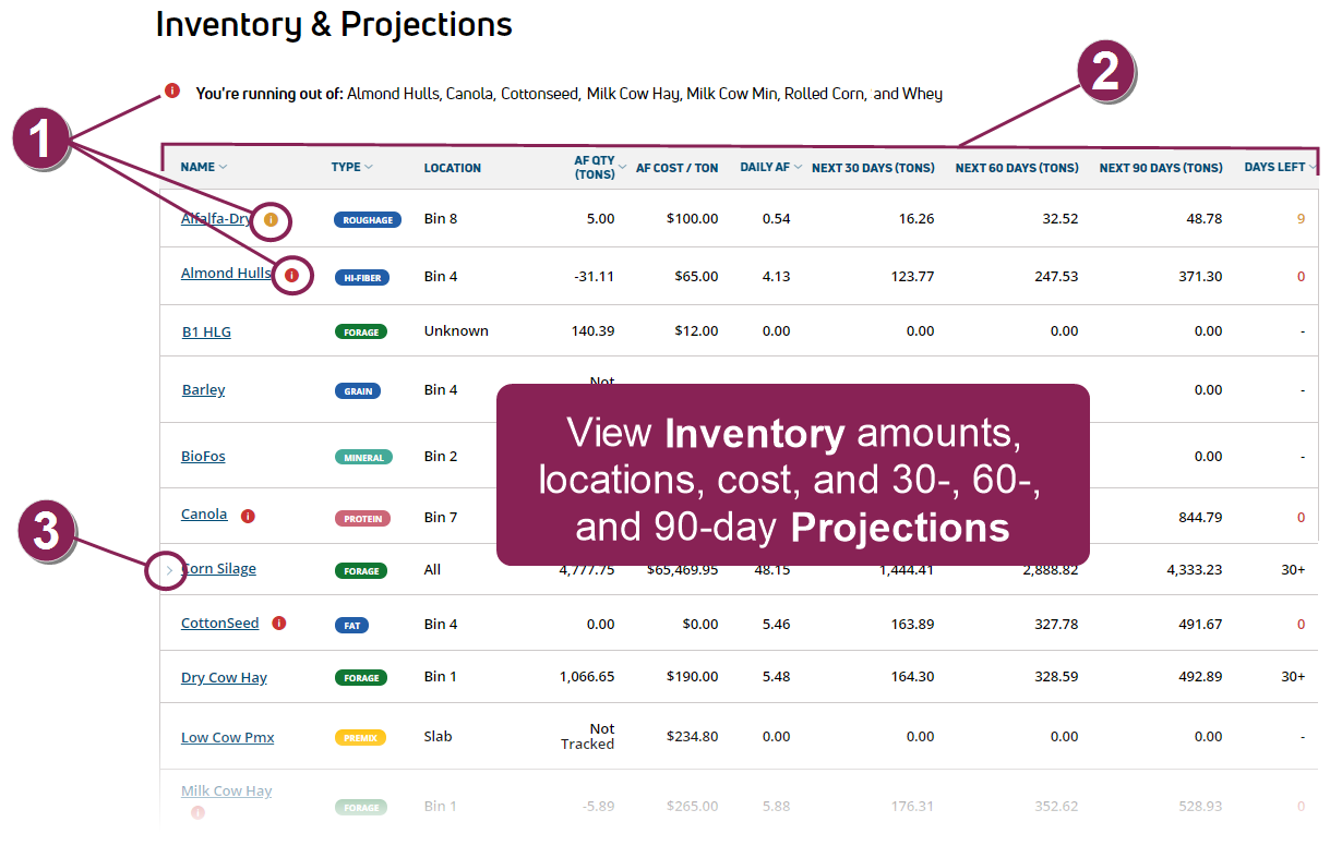The Inventory & Projections page tracks how much feed inventory your dairy has on hand and projects how much is needed over a specified number of days. It also alerts you to any inventory that is running low and how much of each item remains. You can find this feature under the Menu Options.