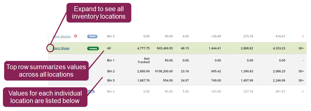 3. View Inventory with Multiple Locations: If you see an expand arrow to the left of an inventory name, it means that the ingredient is stored in multiple locations. Click the arrow to expand the inventory item and view all locations.