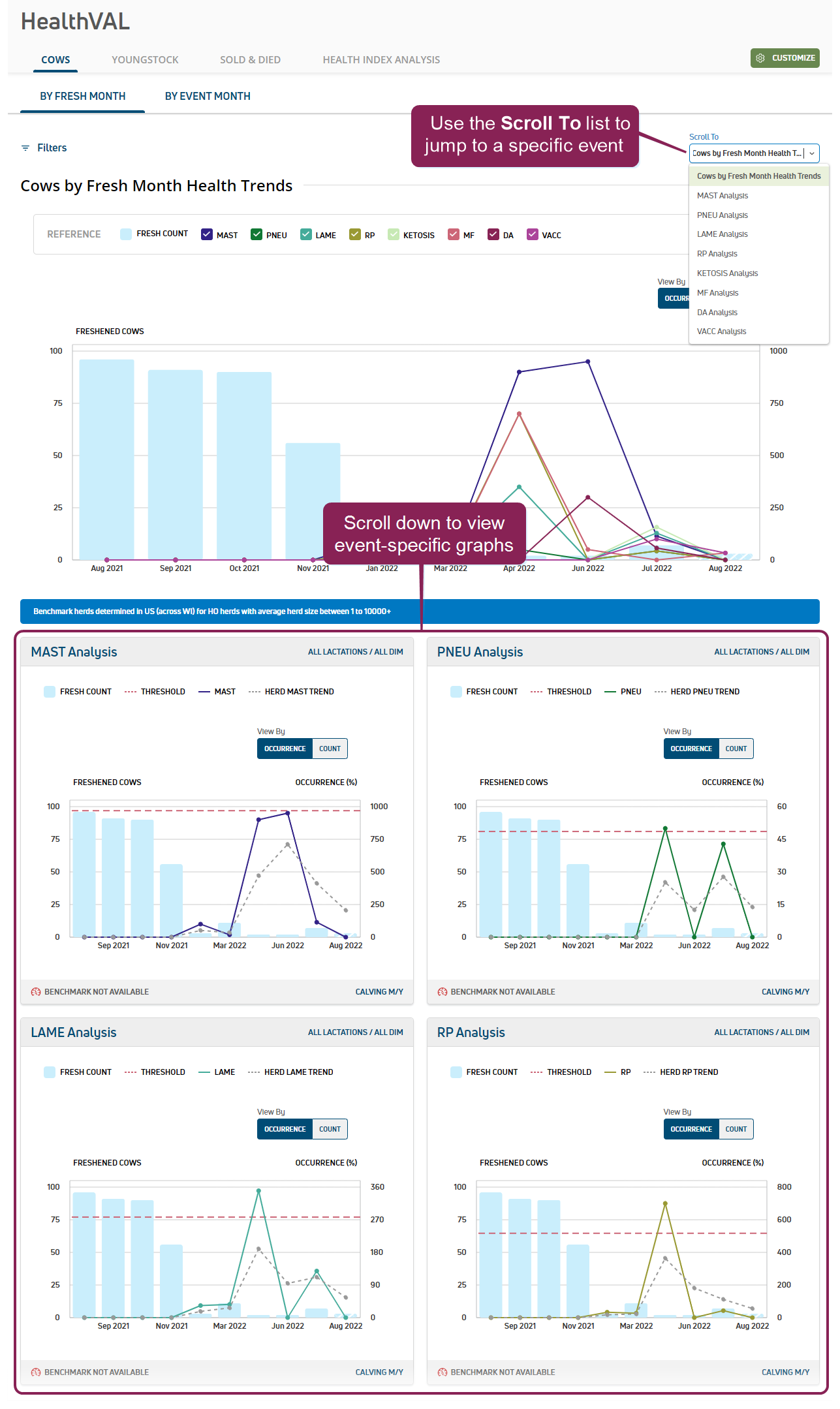 The light blue bar indicates the total number of cows, and hovering over the graph provides details by month. NOTE: For quick association, the HealthVAL line color matches the color currently defined for the event. See Edit Event Definitions for more information. - Herd Event Trend: Use the gray dotted line