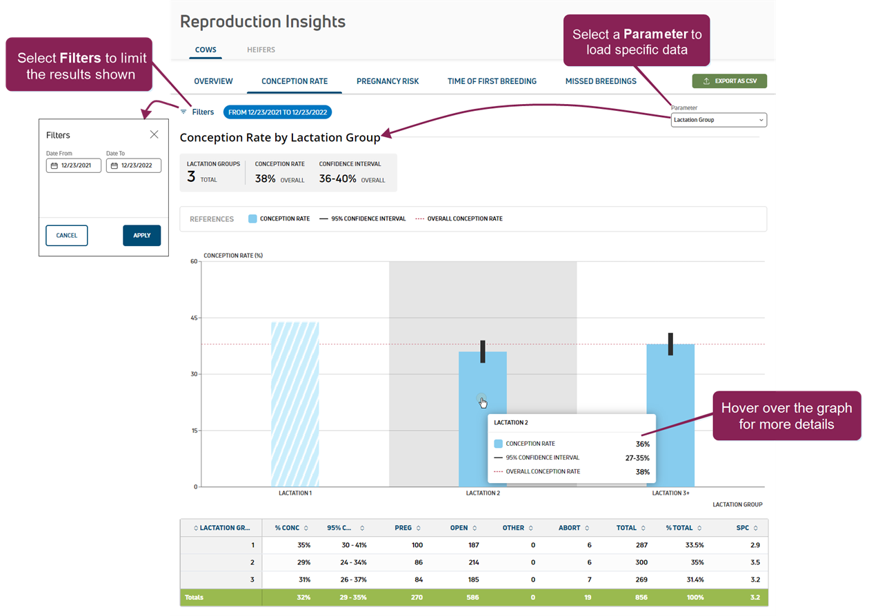 Use the Conception Rate page to examine the factors that impact your herd's conception rate. Click Filters at the top left of the page to limit the data that is displayed Select a specific Parameter, such as technician, stud code, heat interval, etc., to view specific results by category.