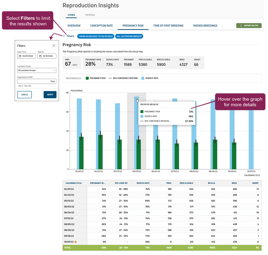 Use the Pregnancy Risk page to examine the factors that impact your herd's pregnancy risk. Click Filters at the top left of the page to limit the data that is displayed.