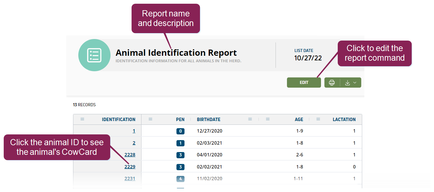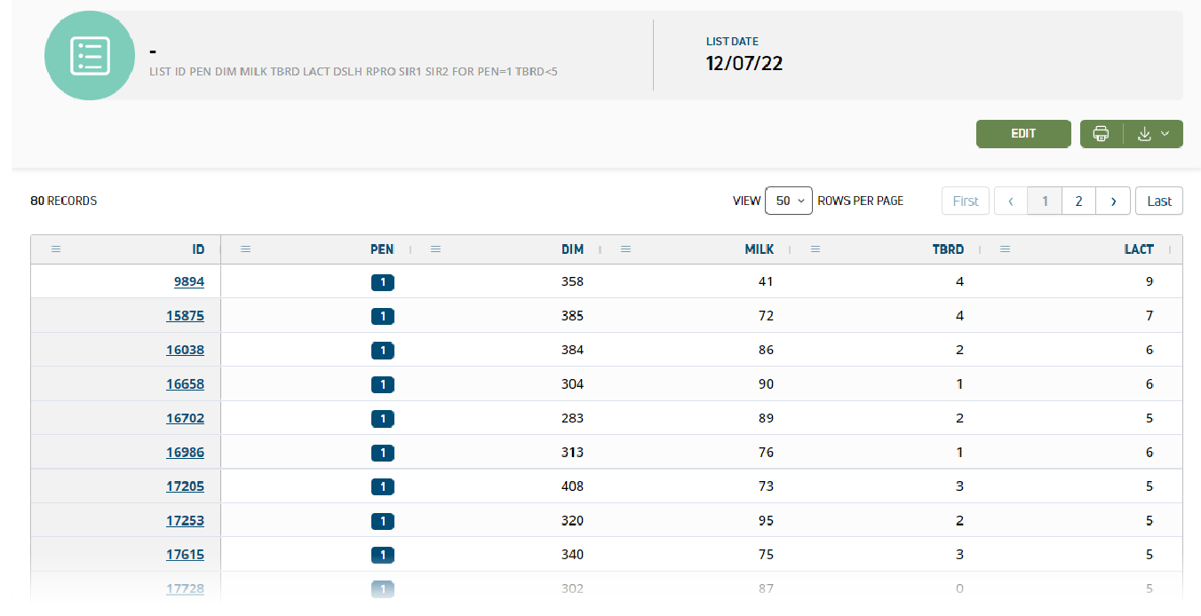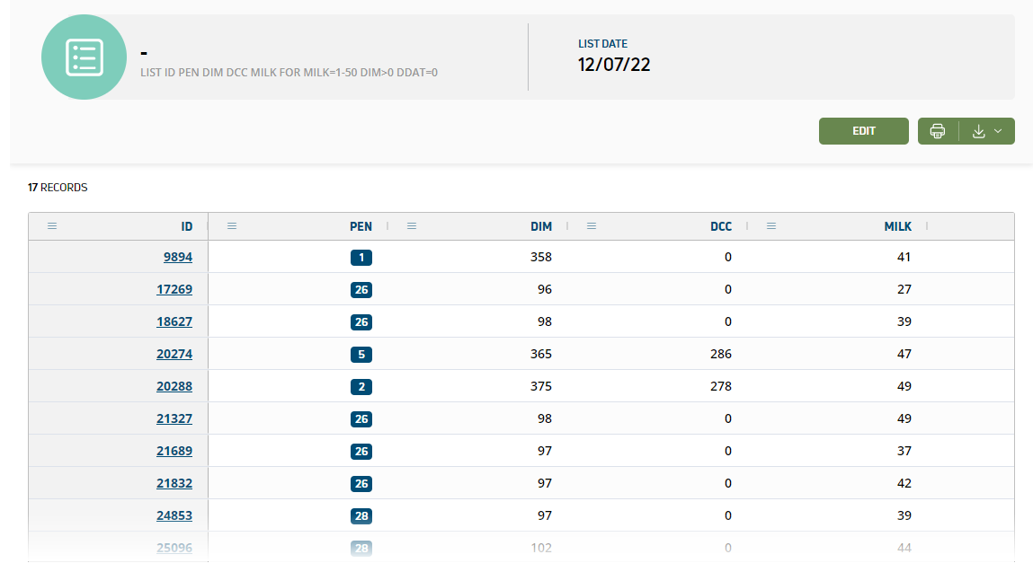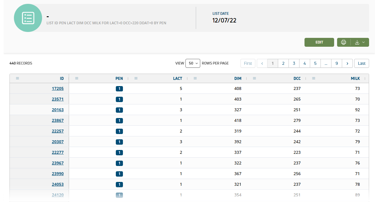 LIST ID PEN LACT DIM DCC MILK FOR LACT>0 DCC>220 DDAT=0 BY PEN