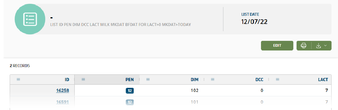 LIST ID PEN DIM DCC LACT MILK MKDAT BFDAT FOR LACT>0 MKDAT>TODAY